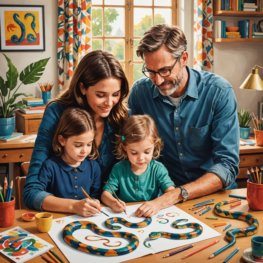 Где найти вдохновение для рисования красивой змеи и кошки с детьми?